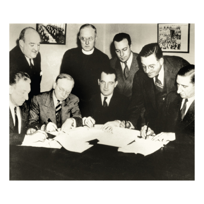 Hatzel & Buehler’s president signs the First Pension Agreement between Local 3, International Brotherhood of Electrical Workers and the New York Electrical Contractors Association.